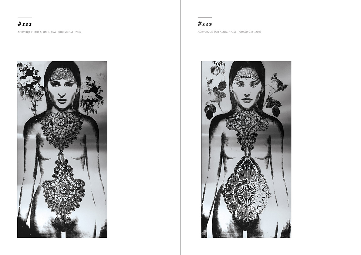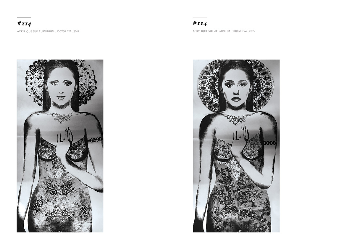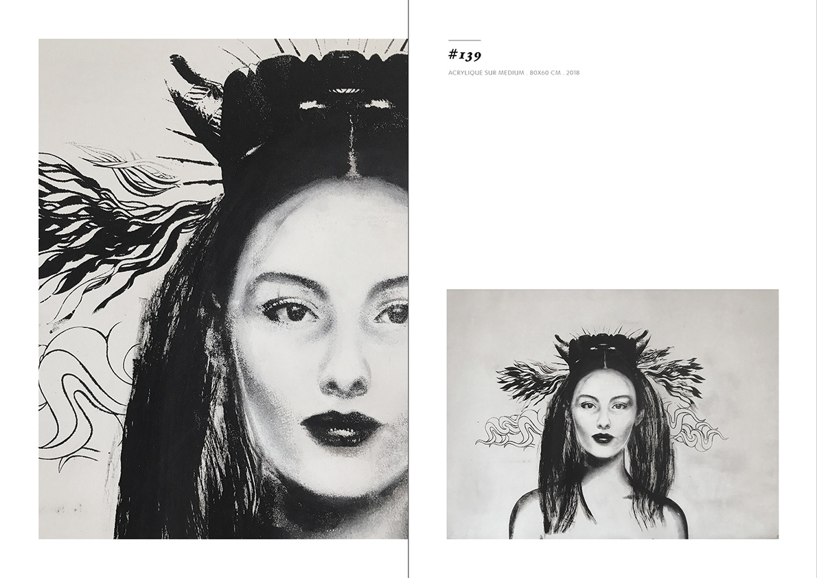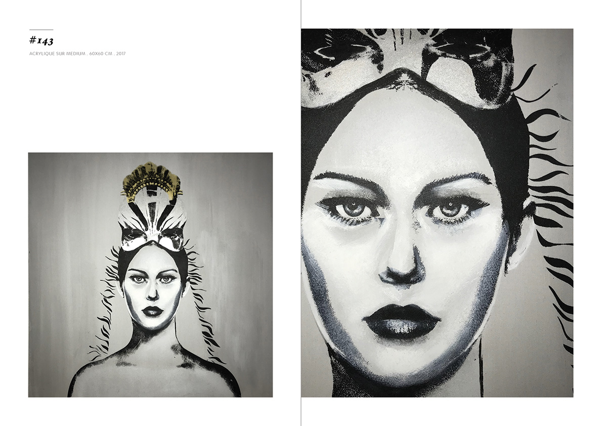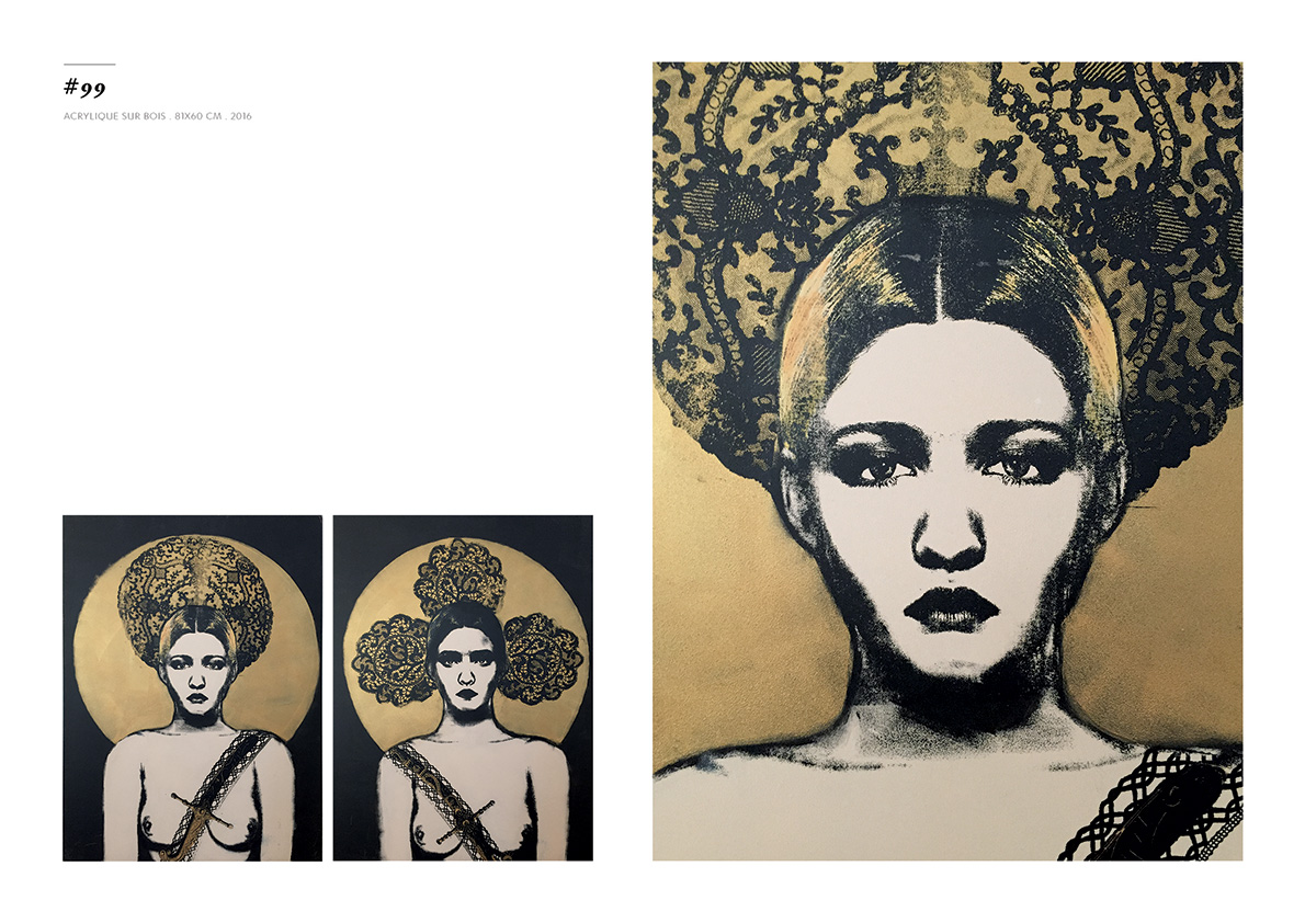 Blackgrayink has been working on a personal artistic search since 2012. From a work done via the digital tool, is added the recovery via screen printing patterns, lace and old engravings. The composition of each painting is unique but is part of a thematic series. Her work focuses on the creation of robot portraits from photo-montages of female characters. Opposite of expressionism; the face is standardized, the portrait are made in a systematic way, face, gaze. The posture is treated in a symbolic way; as in religious iconography, objects become symbols, gestures become a sign.