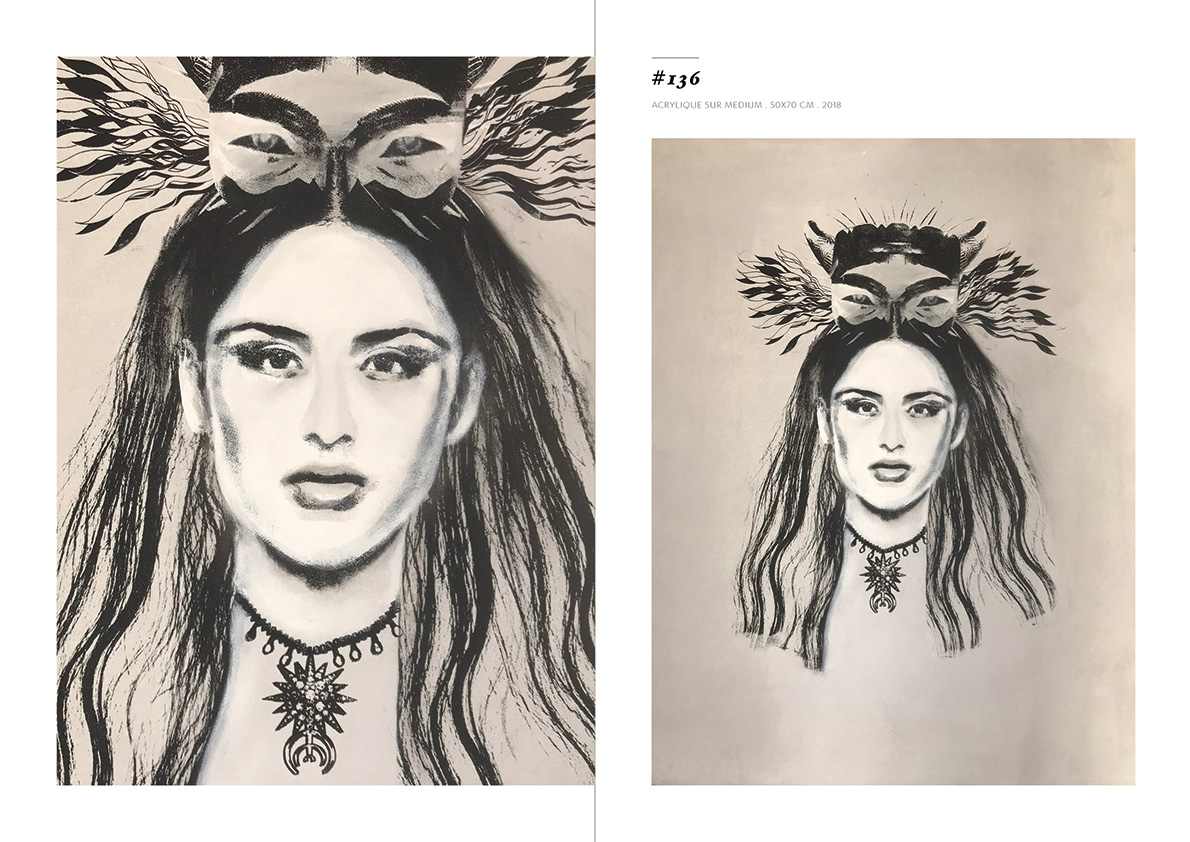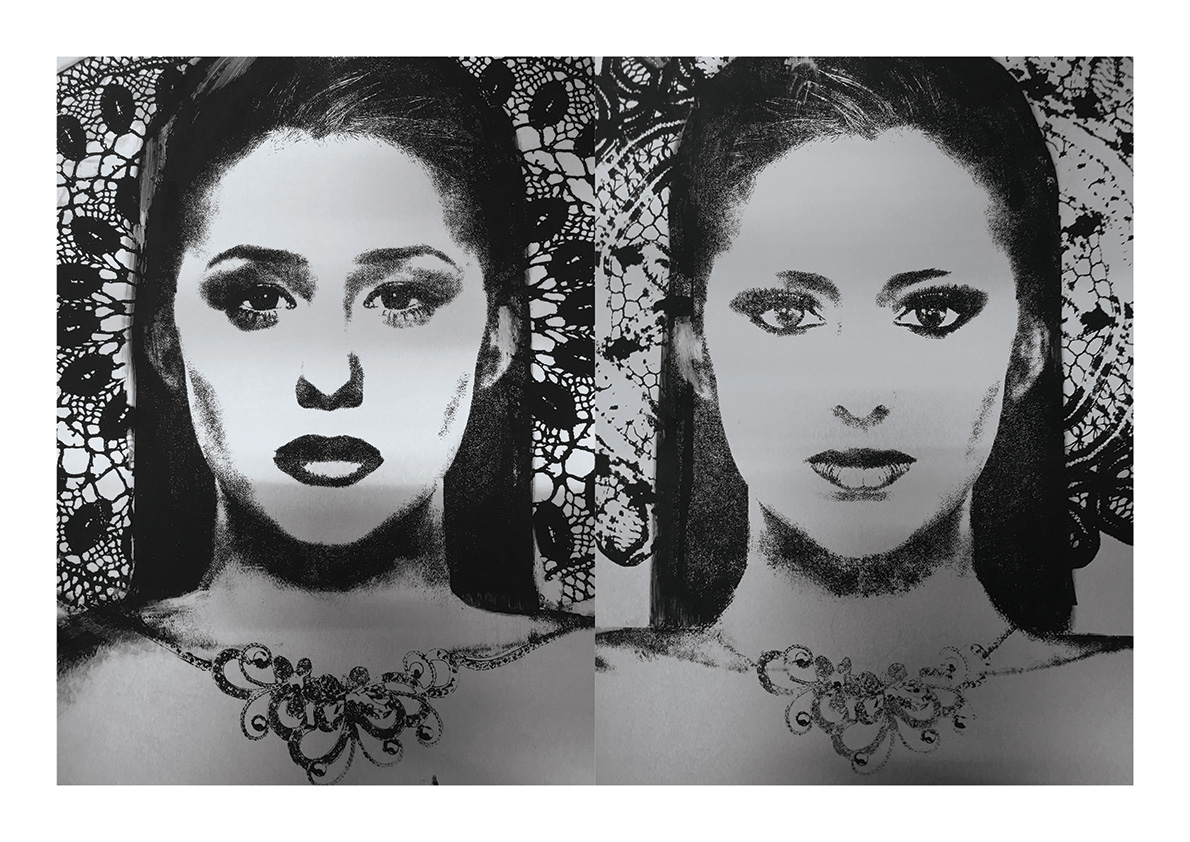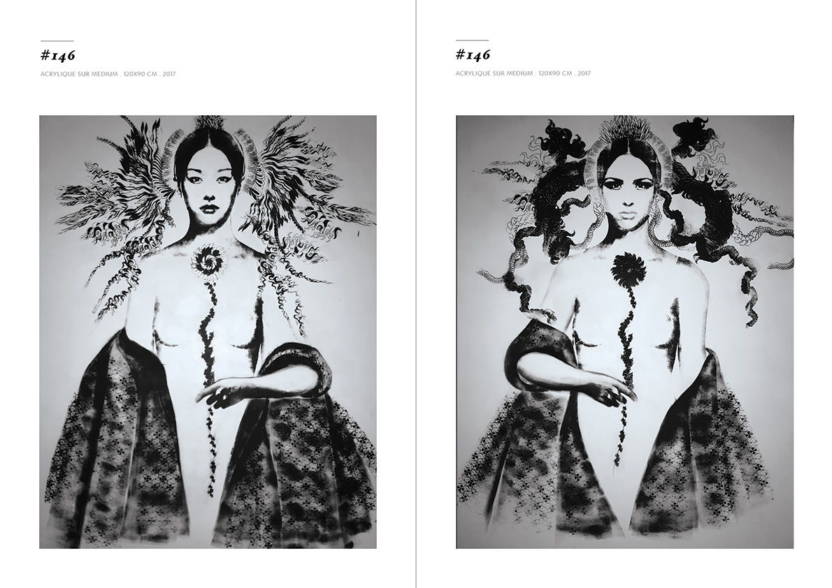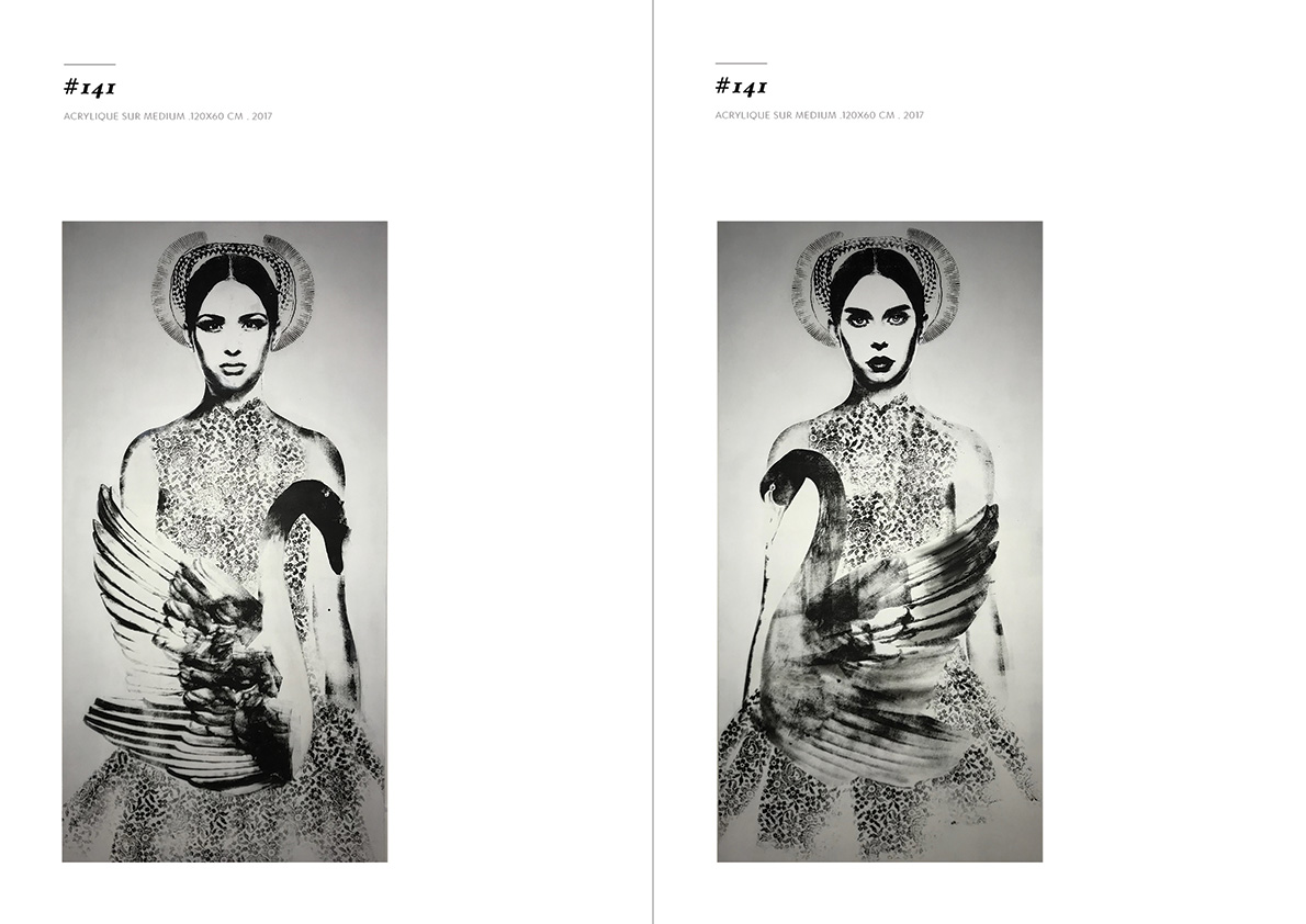 Blackgrayink has been working on a personal artistic search since 2012. From a work done via the digital tool, is added the recovery via screen printing patterns, lace and old engravings. The composition of each painting is unique but is part of a thematic series. Her work focuses on the creation of robot portraits from photo-montages of female characters. Opposite of expressionism; the face is standardized, the portrait are made in a systematic way, face, gaze. The posture is treated in a symbolic way; as in religious iconography, objects become symbols, gestures become a sign.