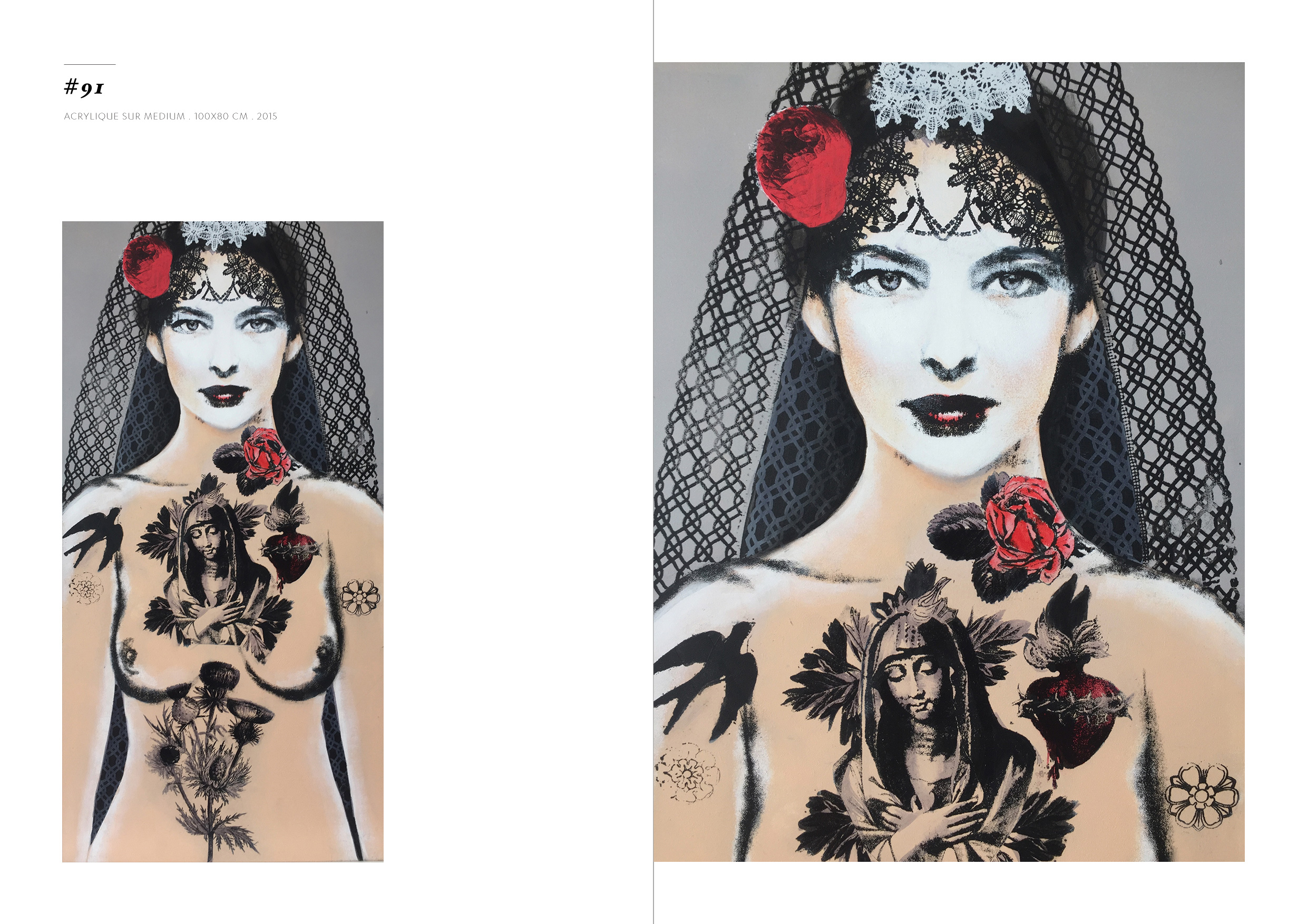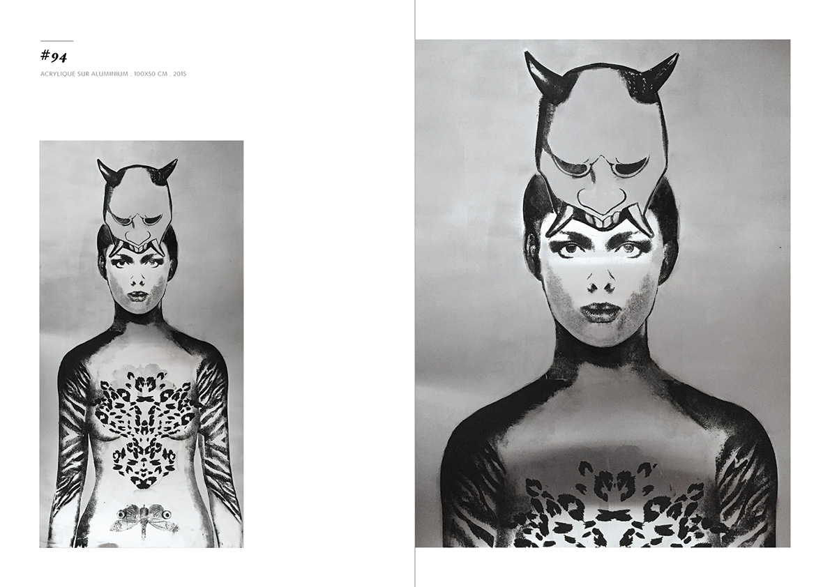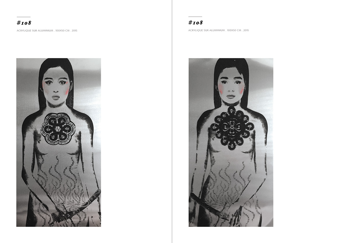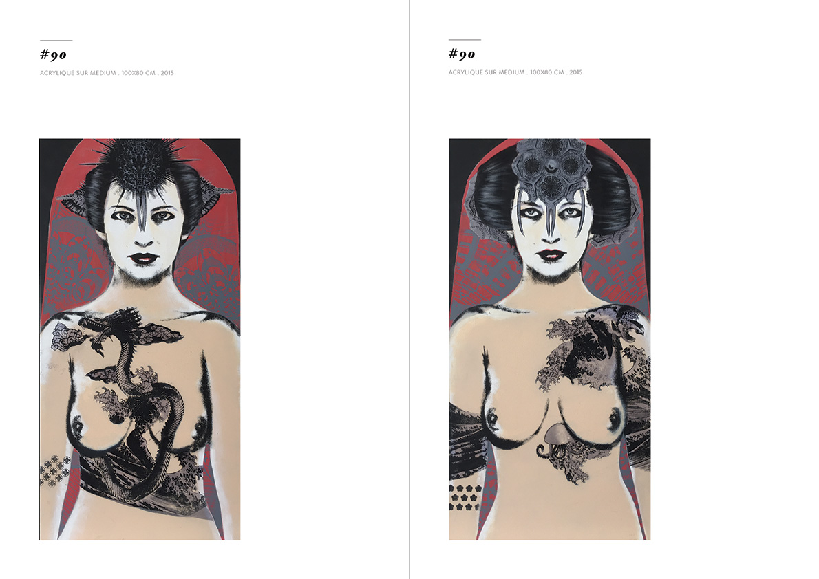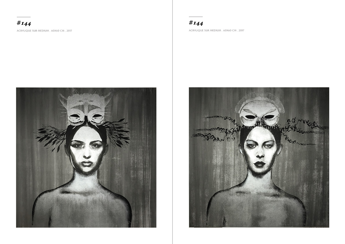 Blackgrayink has been working on a personal artistic search since 2012. From a work done via the digital tool, is added the recovery via screen printing patterns, lace and old engravings. The composition of each painting is unique but is part of a thematic series. Her work focuses on the creation of robot portraits from photo-montages of female characters. Opposite of expressionism; the face is standardized, the portrait are made in a systematic way, face, gaze. The posture is treated in a symbolic way; as in religious iconography, objects become symbols, gestures become a sign.